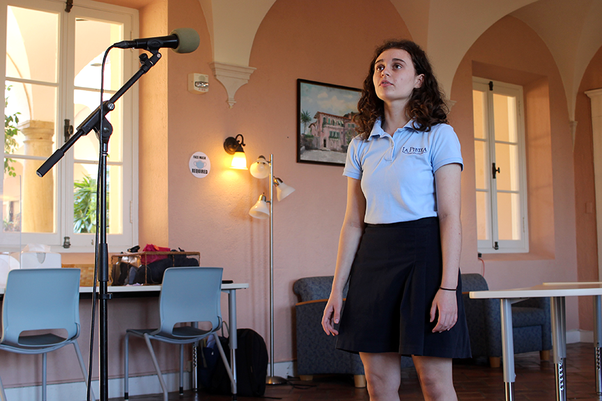 This year, the La Pietra Shakespeare Competition took place virtually in the Student Learning Center. Freshman Olivia R., sophomore Melody H., and junior Sabrina C. anxiously awaited their turn at the mic to recite their carefully memorized Shakespearean monologue. The performance would be an intimidating one -- even without an in-person audience! Their peers were watching (and cheering them on) from their own classrooms over Zoom.