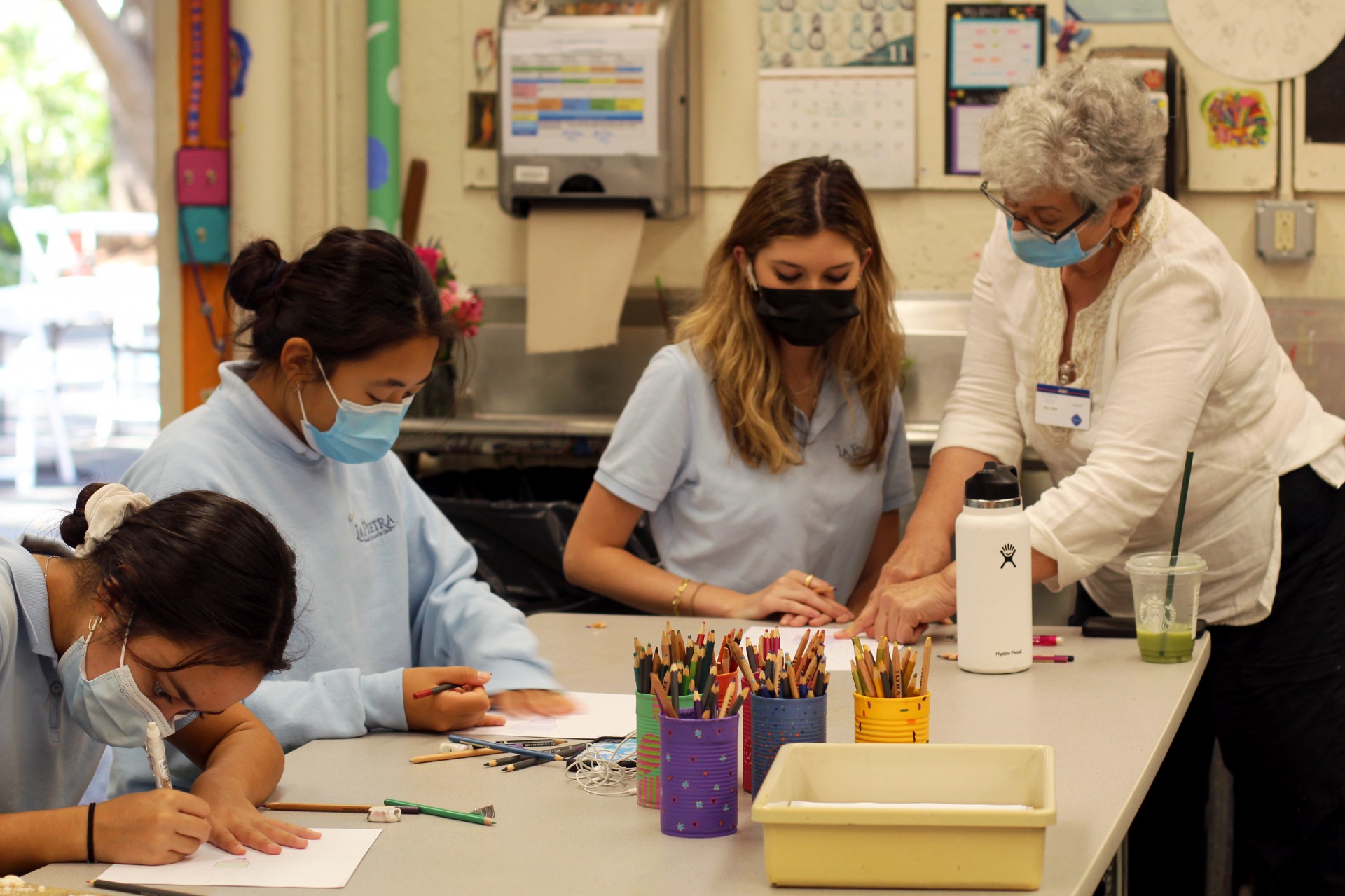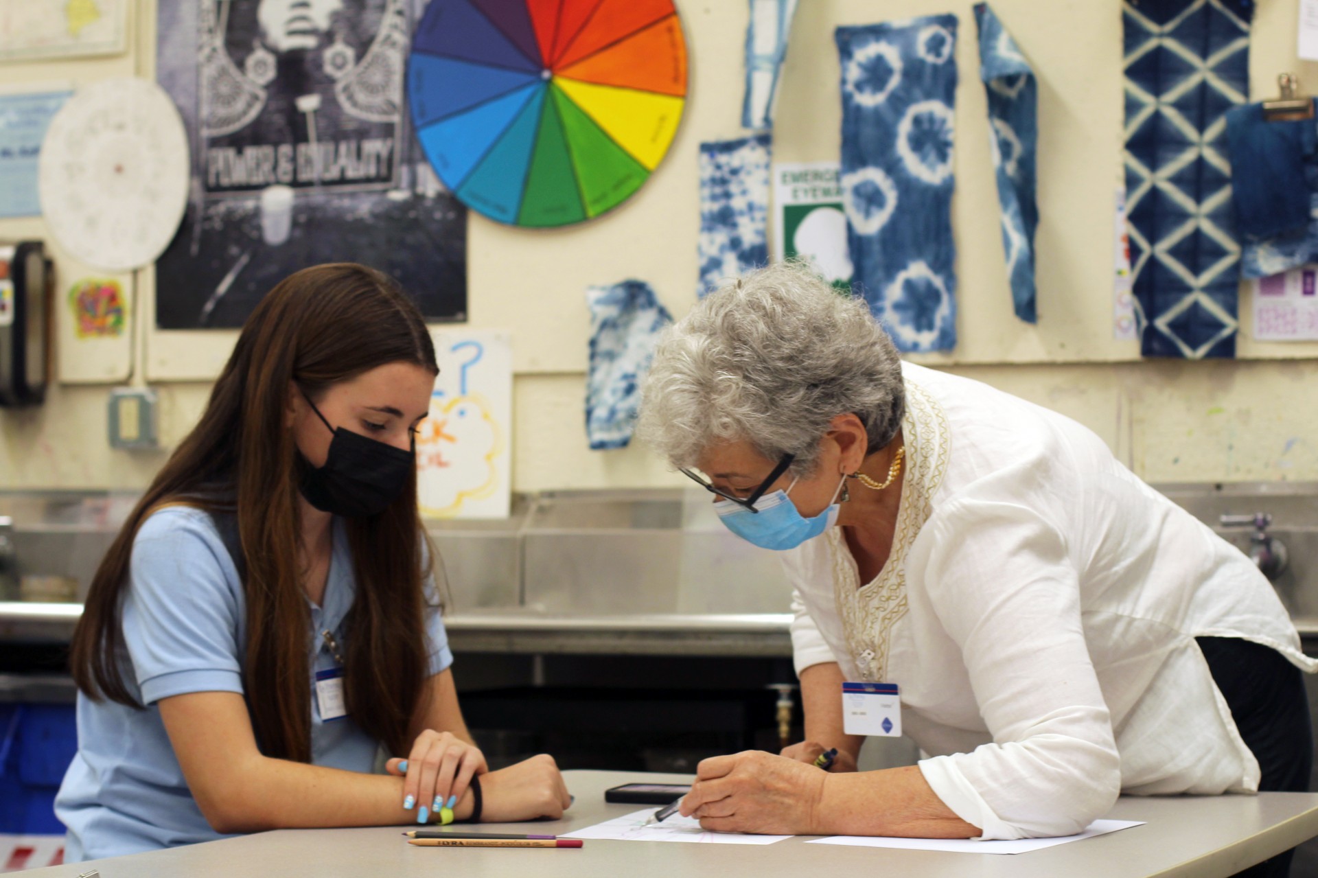 Multimedia Artist Tina Cintron works on drawing projects with students