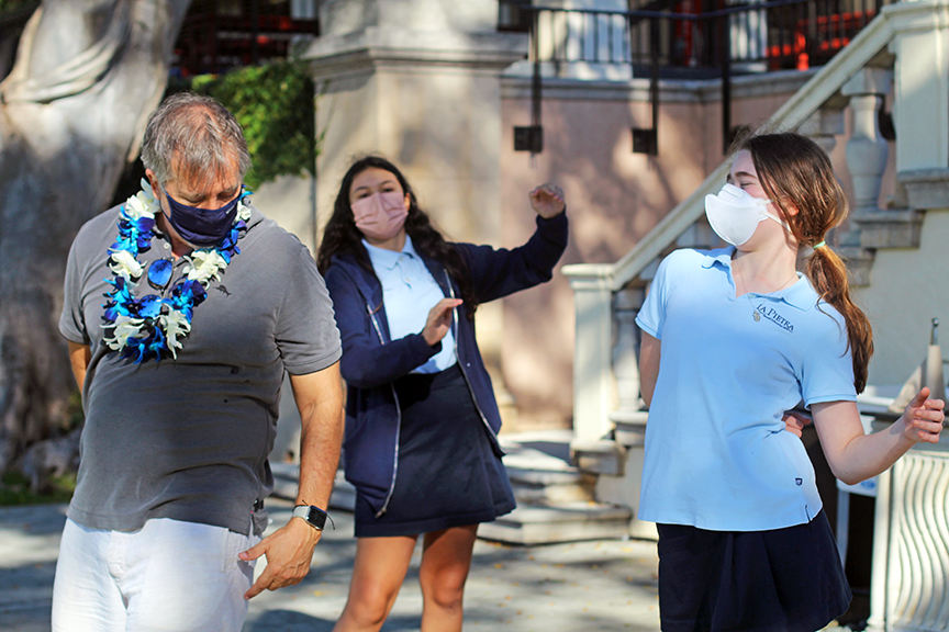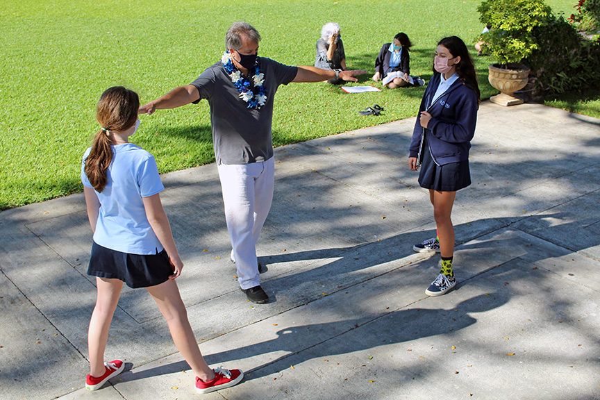 Tony Pisculli works with 7th-graders Liv K. and Leilani S. to stage a socially distant fight scene
