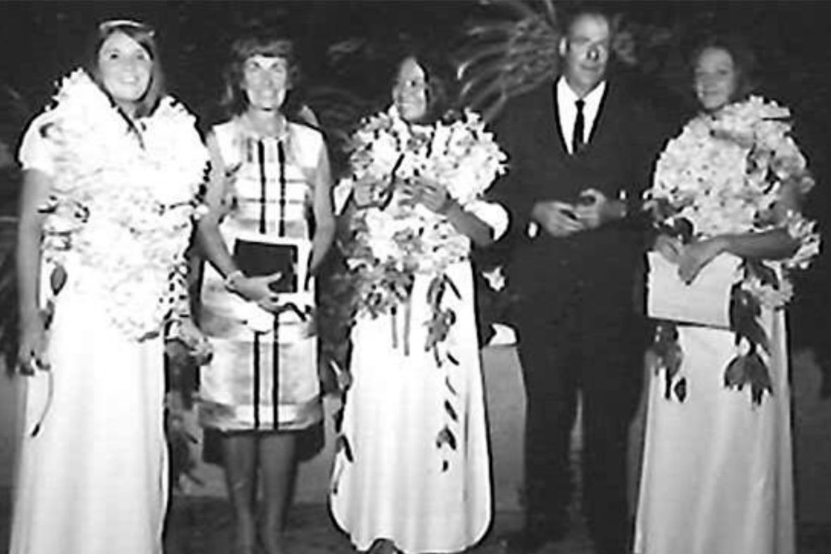 Laurie (Groner) Tillett '67 (far right), Mr. Pynchon, and the first graduating class of Hawai‘i School for Girls in 1967.