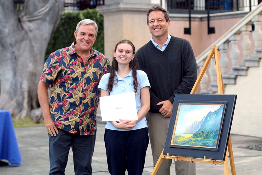 Artist Michael Powell and Head of School Josh Watson with Sabrina C. as the winner of the Alice Guild Kahiau Award.
