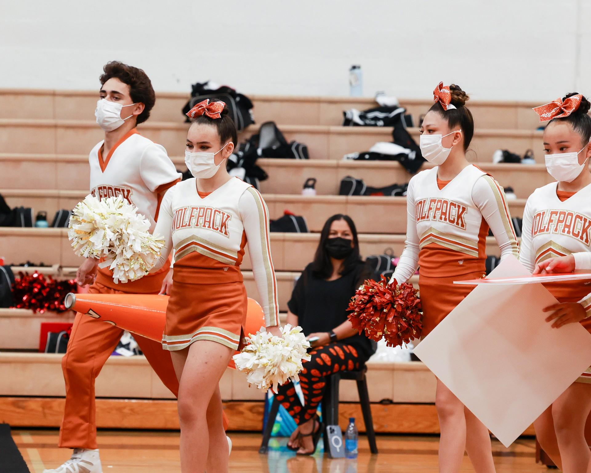 Junior Cece N. (second from left) gets ready to take the stage with the Pac-5 Varsity Cheerleading team