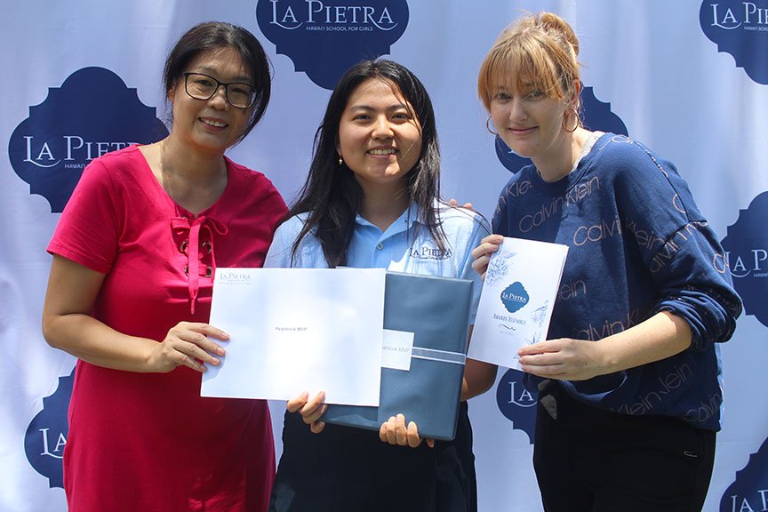 Megu Kurita and advisors Ms. Huang and Ms. Wiseman after being named Yearbook MVP