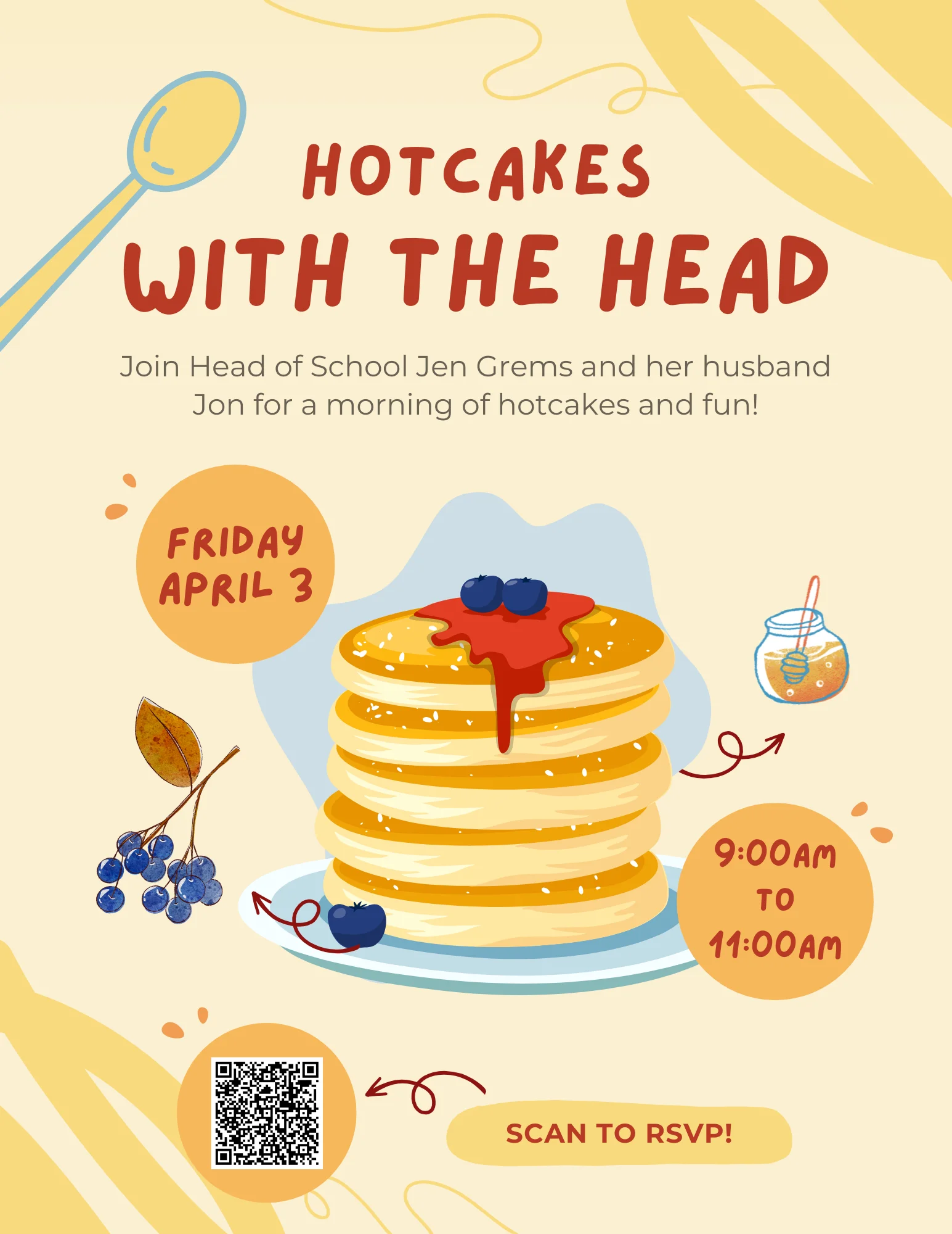 Students and families - swing by HSG on Friday, April 3 between 9:00-11:00 AM for Hotcakes with the Head! Mrs. AND Mr. Grems will be serving up freshly cooked pancakes to start your school holiday off right. Click here to RSVP... and bring your appetite!
